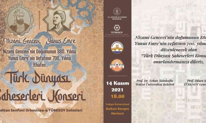 Trakya Üniversitesi ev sahipliğinde Nizami Gencevi’nin Doğumunun 880. Yılına Yunus Emre’nin Vefatının 700. Yılına İthafen “Türk Dünyası Şaheserleri Konseri” düzenlenecek. Kültür ve Turizm Bakanlığı, Uluslararası Türk Kültürü Teşkilatı (TÜRKSOY) ve Trakya Üniversitesi iş birliğinde gerçekleştirilecek konserde, 5 farklı ülkeden 13 tanınmış sanatçı sahneye çıkacak.