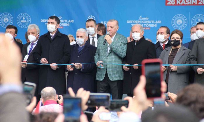 İzmir’de geçen yıl meydana gelen depremin ardından tamamlanan 596 konut ve 145 işyerini İzmirli depremzedelere teslim eden Cumhurbaşkanı Recep Tayyip Erdoğan, “Daha kendi hizmet binaları ile ilgili meselelerini çözemeyenlerin İzmir’i 2023’e, 2053’e taşıyan bir vizyon ortaya koyabilmeleri zaten mümkün değildir. Depremin ardından buraya geldiklerinde kendilerinden güvenli evlere sahip olmak isteyen vatandaşları, ‘devlet yapsın’ diyerek tersleyenlerden İzmir’e hayır gelmez” dedi.