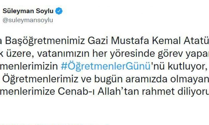 İçişleri Bakanı Süleyman Soylu, yayınladığı mesajla Öğretmenler Günü’nü kutladı. Soylu, “Başta Başöğretmenimiz Gazi Mustafa Kemal Atatürk olmak üzere, vatanımızın her yöresinde görev yapan öğretmenlerimizin Öğretmenler Günü’nü kutluyorum” dedi.